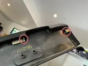 С каждой стороны пластикового элемента, закрывающего некоторые отверстия для винтов, вы можете найти очень маленькие щели. Вставьте очень узкую и плоскую лопатку, чтобы нажать на зажим. Он должен отскочить вниз. Это нужно сделать с обеих сторон.