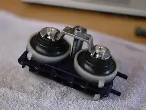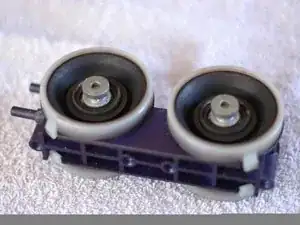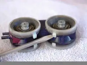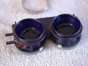 Теперь, когда привод вынут из двери, можно приступать к замене диафрагм. Снимите металлическую перекладину между двумя комплектами диафрагм, аккуратно поддев плоской отвёрткой круглый металлический участок каждой диафрагмы.