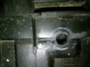 Снимите крышку корпуса и аккуратно отпилите оставшуюся часть сломанного штуцера заподлицо с крышкой, чтобы затем было проще рассверлить отверстие.