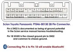 Хотя он проверяет подключение микрофона, детекция не связана с контактами микрофона. Контакт 6 SNS2 в документации по диагностике жгута Scion указан как находящийся на потенциале земли. Я обнаружил, что соединение SNS2 с корпусом блока приводит к включению Bluetooth! Вероятно, это "сенсорный" контакт, судя по названию.