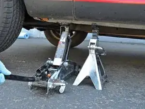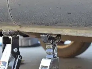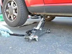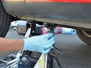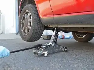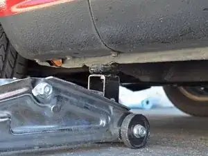 Начните подъём переднего левого угла автомобиля домкратом, установив домкрат между двумя вырезами ближе к передней части автомобиля на длинной вертикальной части рамы.