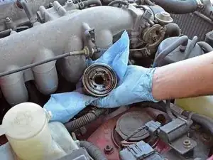 Подложите тряпку или полотенце под масляный фильтр и возьмите фильтр рукой. Тряпка будет улавливать подтёки масла при снятии фильтра.