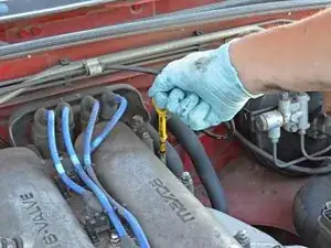 Снова откройте капот и найдите жёлтый щуп уровня масла в задней части двигателя с правой стороны.