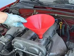 Вставьте крупную воронку в заливное отверстие на верхней крышке клапанов.