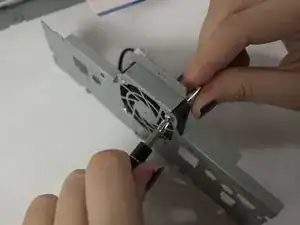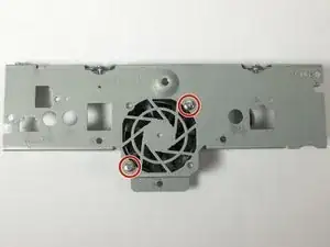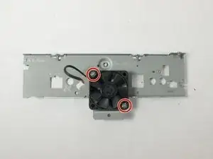Снимите два машинных винта 1-64 x 1/2 дюйма и стопорные гайки, крепящие вентилятор охлаждения к задней панели, используя крестообразную отвёртку Phillips #0 и головку 5/32 дюйма.