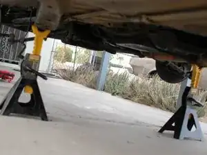 Установите задние опоры домкрата в прочное и надёжное место. В задней части автомобиля есть несколько вариантов, и выбор часто зависит от выполняемой работы.