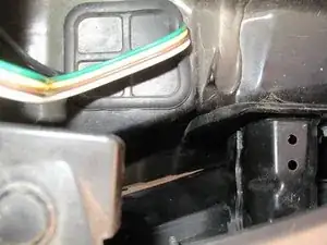 Над боковыми панелями находятся задние облицовочные панели, которые можно поддеть пластиковой лопаткой. Верхние пластиковые заклёпки жесткие и могут выскочить из панели, но их можно вынуть и затем снова надеть на панель. После этого становятся видны жгуты фонарей с обеих сторон.