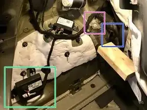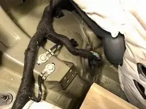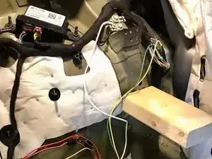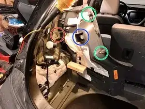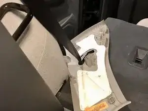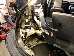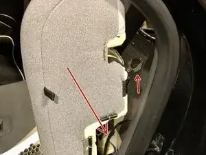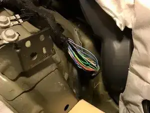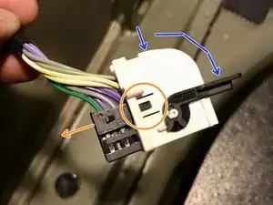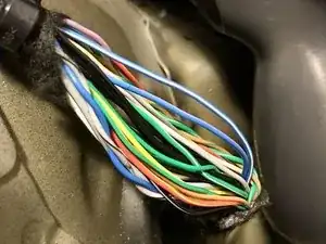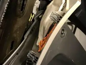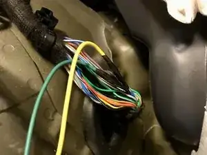 Провод подушки бокового удара по‑прежнему подключён, но отведение этой обивки позволяет панели шире открыться, чтобы получить доступ к проводам указателя поворота в жгуте бампера