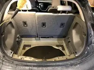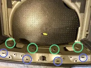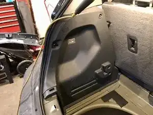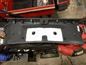 Когда вертикальная часть панели отщёлкнется, потяните вверх, чтобы снять оставшиеся клипсы с горизонтальной поверхности. Панель выйдет из‑под уплотнителя багажника
