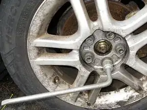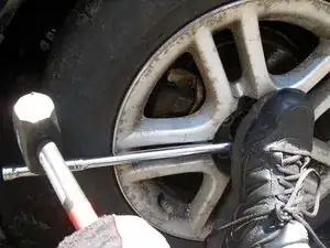 Затяните ручной тормоз и поставьте автомобиль на первую передачу или на «Park». Ослабьте гайку ступицы с помощью лома; можно использовать более длинный лом или металлическую трубу для увеличения рычага. На стороне пассажира использование домкрата для создания рычага сработало. На другой стороне помог резкий удар киянкой.