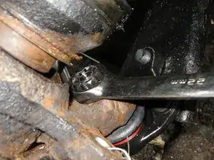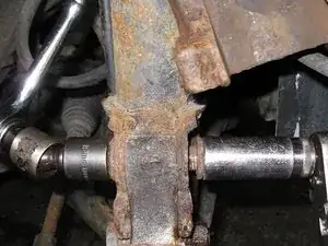 Рычаг подвески снимается с двумя болтами 19 мм после небольшой подачи тепла. Вертикальные болты удерживаются 19 мм болтом. После его удаления втулка немного сдвинется и удержит болт наполовину — зажмите его тисками и ударьте тисками вниз, чтобы вынуть болт.