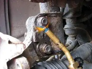Снимите болты, соединяющие ступицу со стойкой. Сначала хорошенько прогрейте их (на стороне водителя я держал горелку несколько минут!) пропановой горелкой.