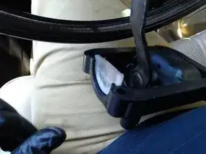 Вы увидите пластиковую полу-луну (чтобы пыль и шум не попадали в салон) — она просто вытаскивается.