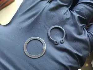 Я использовал маленькую отвёртку и плоскогубцы с тонкими носами, чтобы снять стопорное кольцо (сдвинуть в направлении красной стрелки).