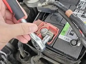 Используйте гаечный ключ на 10 мм, чтобы ослабить гайку на положительном (красном) контакте.