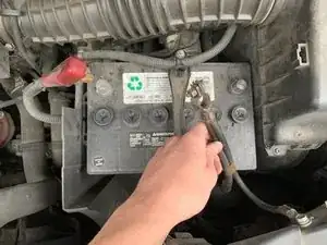 Используйте плоскогубцы, чтобы ослабить отрицательный (-) кабель от аккумулятора. Затем ослабьте положительный (+) кабель от аккумулятора.