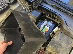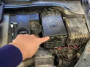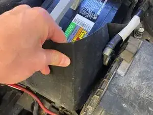 В этой модели аккумулятор находится под этой крышкой в верхнем правом углу моторного отсека.