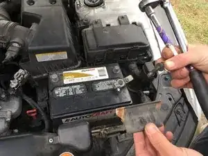 Найдите аккумулятор автомобиля и используйте трещотку, чтобы ослабить отрицательный (-) кабель.