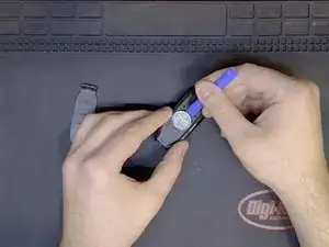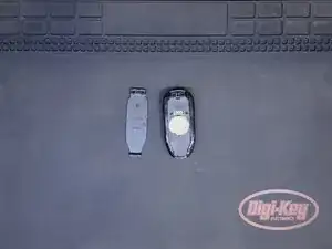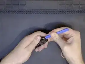 С помощью маленького инструмента для вскрытия осторожно нажмите на небольшой углубление рядом с передней частью ключа, приподнимая его, чтобы снять крышку батареи.