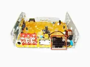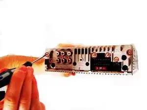 Отвинтите восемь золотых винтов крестовой отверткой PH0 (длина — 9.26 мм), расположенных на задней стороне стереосистемы.