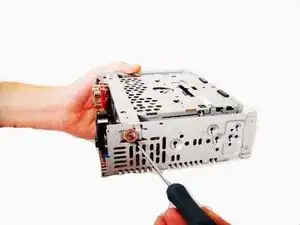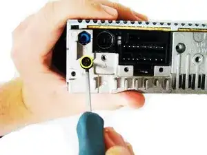 Отвинтите один золотой винт крестовой отверткой PH0 (высота — 7.47 мм) на верхней части стереосистемы.