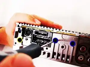 Отвинтите два золотых винта крестовой отверткой PH0 (длина — 7.34 мм), расположенные по обеим сторонам стереосистемы.