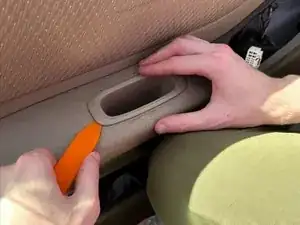 Полностью снимите обивку двери, нащупав зазор внизу двери. Используйте прочную лопатку, чтобы отжать обивку.