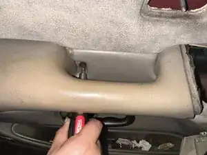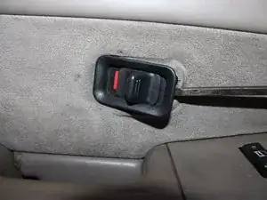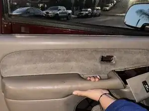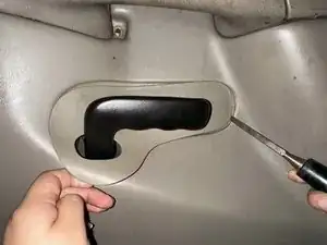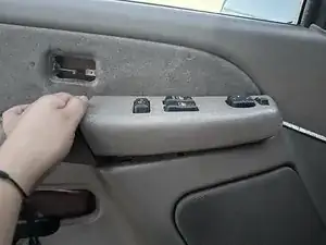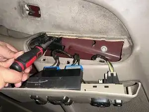 С помощью угловой отвёртки снимите накладку дверной ручки и пластиковую панель обшивки двери. Затем, также используя угловую отвёртку, снимите накладку блока переключателей стеклоподъёмника.