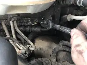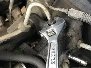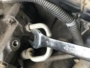 Используйте ключ 5/8", чтобы снять последнюю магистраль питания гидроусилителя. Снова обращайте внимание на грязь и посторонние частицы.