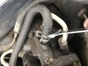 С помощью плоскогубцев или зажима снимите одну из трубок усилителя рулевого управления. Возможно подтекание — держите рядом тряпку.