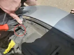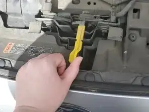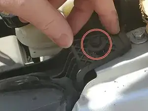 Приподнимите капот и найдите фиксатор, затем сдвиньте его влево.