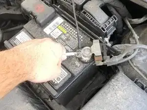 Используйте ключ на 10 мм, чтобы ослабить болт на отрицательном (-) кабеле аккумулятора, затем снимите его с отрицательного (-) клеммного столба.