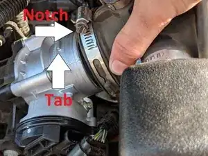 Установите патрубок впуска, уделив особое внимание тому, чтобы выемка на патрубке селась на выступ дроссельного узла. Это поможет обеспечить правильное расположение. Затем затяните хомут, фиксирующий патрубок.