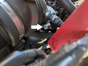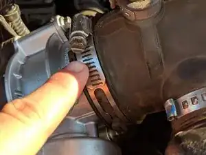Найдите хомут, соединяющий дроссельный узел с резиновым патрубком воздушного впуска, и отсоедините хомут плоской отверткой или головкой на 8 мм (если применимо). *Если патрубок трудно найти, он находится со стороны водителя, идет от большого воздушного фильтра и заканчивается у дроссельного узла*