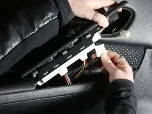 Подденьте корпус переключателя стеклоподъёмника плоской отверткой и выньте его из подлокотника.