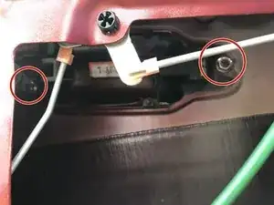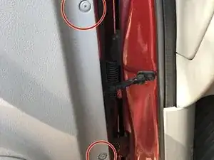 За отогнутым пластиком находятся два болта, и ещё один с внешней стороны дверцы за небольшой пластиковой заглушкой.