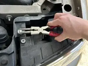 Используйте пассатижи или головку на 11 мм, чтобы снять оба болта корпуса фары.
