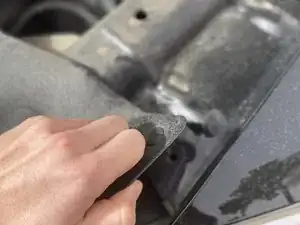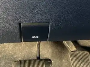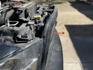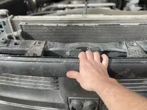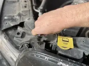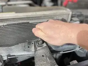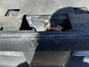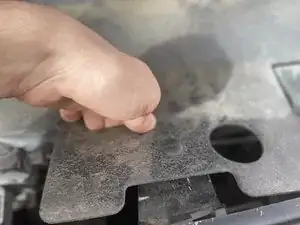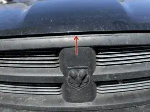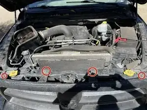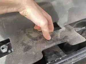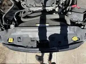 Отогните четыре защёлки вокруг пластиковой крышки над решёткой радиатора, чтобы открыть доступ к четырём болтам.
