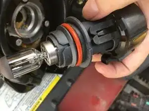 Следующий провод подключён к основной лампе в фаре. Поверните пластиковое чёрное крепление вокруг провода против часовой стрелки — тогда можно снять лампу ИЛИ просто отщелкнуть фиксатор, удерживающий провод. Примечание: В моей замене лампы шли в комплекте, поэтому я просто снял провод.