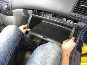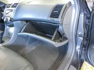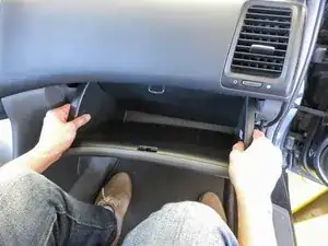 Нажмите на стороны бардачка внутрь и опустите весь бардачок, чтобы освободить его от панели приборов. Поддержите бардачок ногой.
