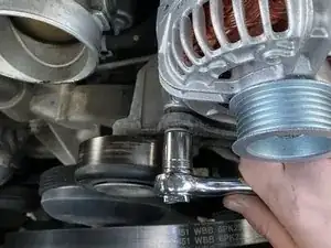 Поместите ремень между вашей торцевой головкой на 15 мм и натяжным роликом.