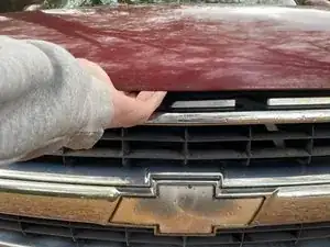 После того как рычаг будет выдвинут, подойдите к передней части автомобиля и поднимите защёлку под центром капота.
