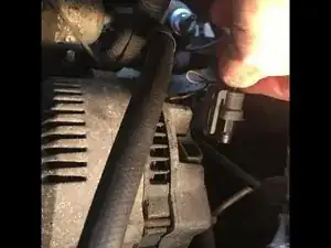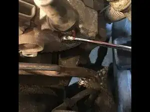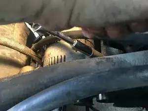 Первый крепёжный болт на самом деле представляет собой шпильку, которая также держит линию кондиционера. После снятия гайки 15 мм отведите линию в сторону, чтобы открыть доступ ко второму болту 15 мм с головкой, чтобы снять шпильку.