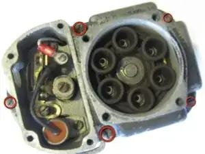Используйте отвёртку с плоским лезвием #2 для удаления пяти винтов на корпусе магнето, обозначенных красными кругами.