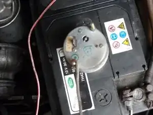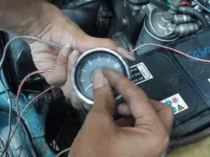 Подсоедините винт (расположенный за часами) к отрицательной клемме источника питания, а затем маленький контакт к положительной клемме.