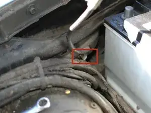Ослабьте и удалите этот болт на 13 мм, который держит кабель к металлу кузова автомобиля.