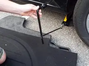 Чтобы поднять автомобиль, поворачивайте баллонный ключ (соединённый с крюком домкрата) по часовой стрелке. Поднимайте до тех пор, пока шина не будет на один дюйм (примерно 30 мм) от земли.