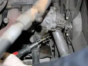 Во время снятия корпуса термостата вы уже ослабили верхний хомут на коротком патрубке. Теперь ослабьте нижний хомут.