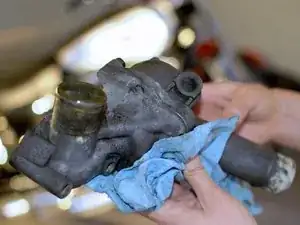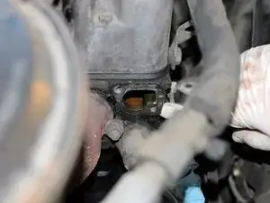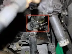 Установите новый патрубок, затем заново установите корпус термостата и прокладку.