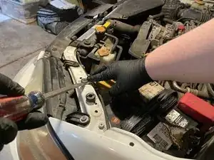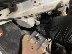 Снимите пластиковую защёлку бачка омывателя ветрового стекла, поддев плоскую отвёртку под головку защёлки, а затем потянув защёлку вверх.